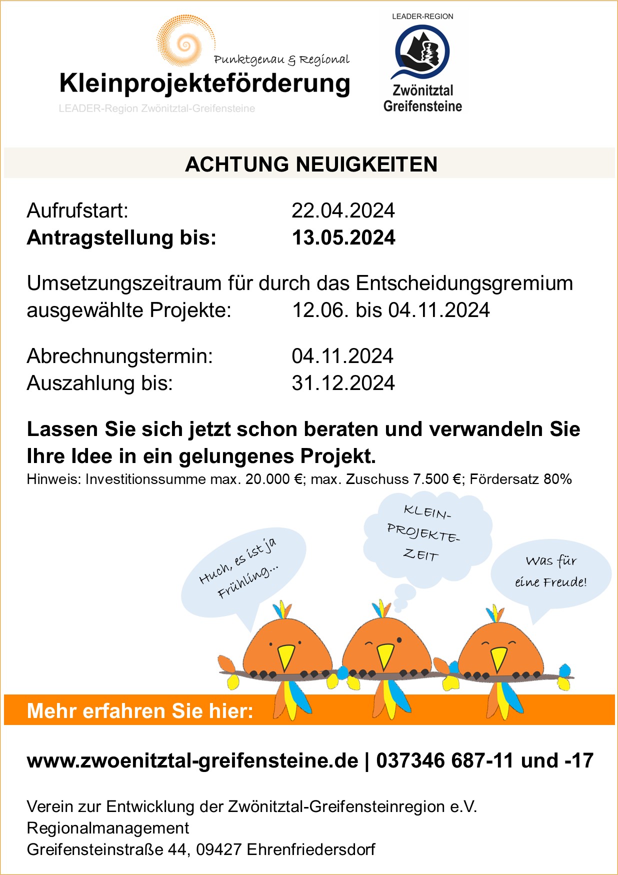 Den detailierten Aufruf und alle dazugehörigen Dokumente erhalten Sie hier auf unserer Website unter https://zwoenitztal-greifensteine.de/kleinprojektefoerderung/aufrufe-kleinprojekte.html